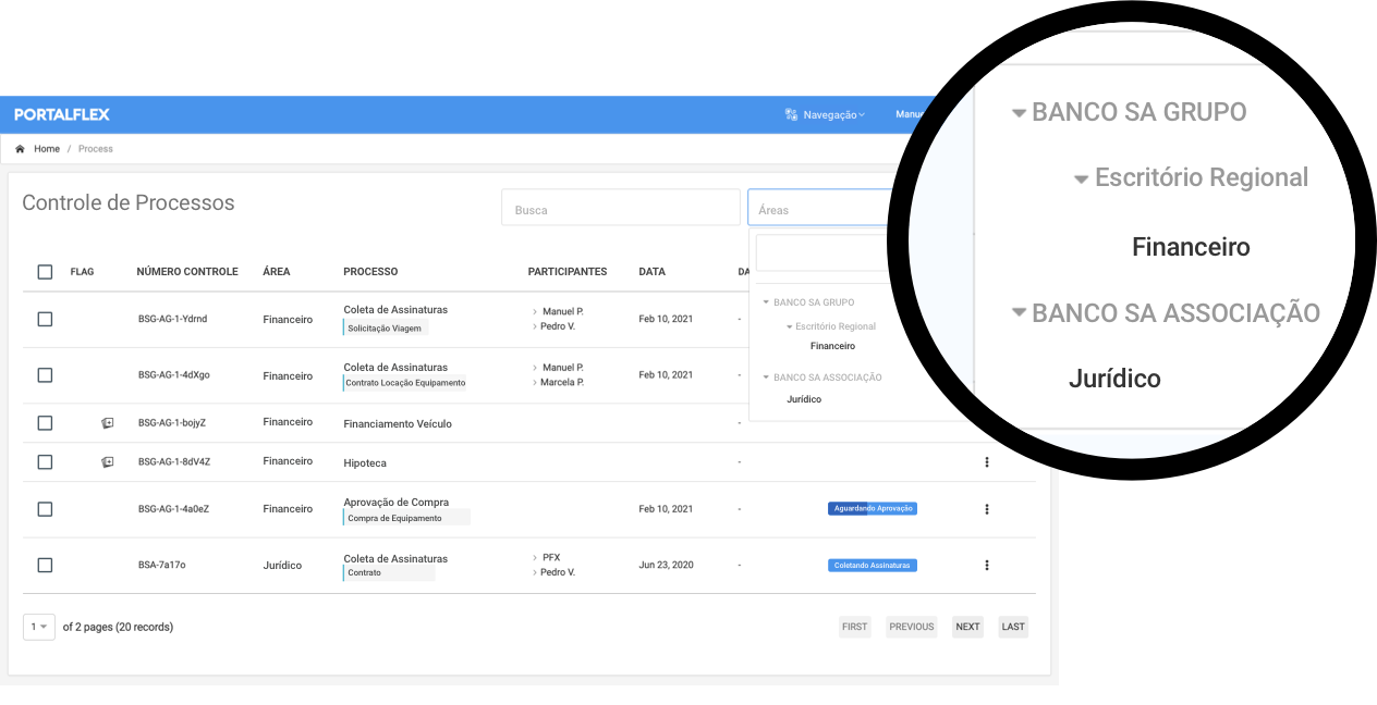 Um funcionário que trabalha em uma filial, por exemplo Escritório Regional --> Setor Financeiro somente visualizará os processos da sua área.